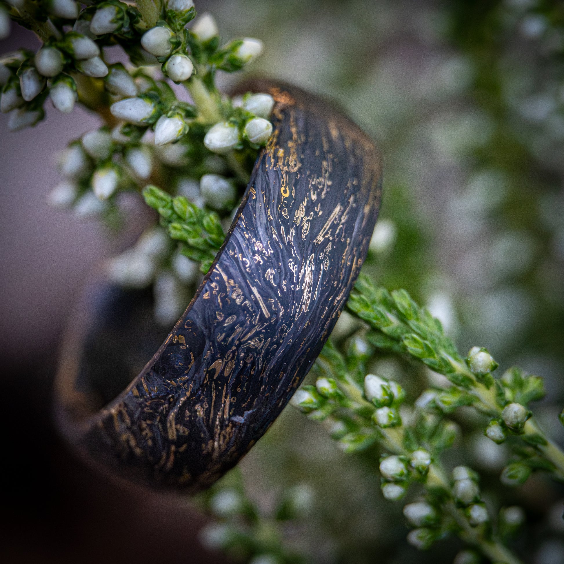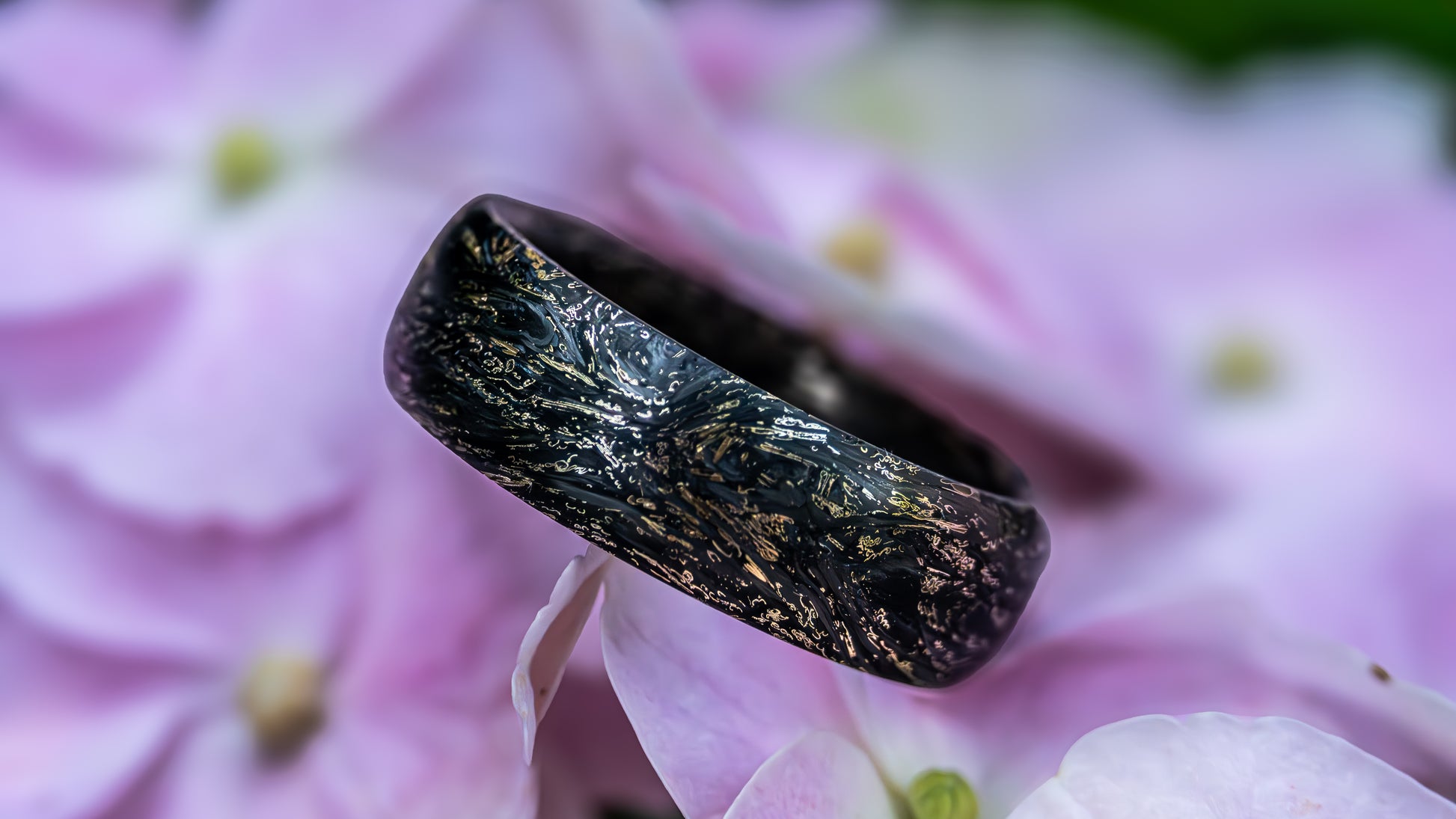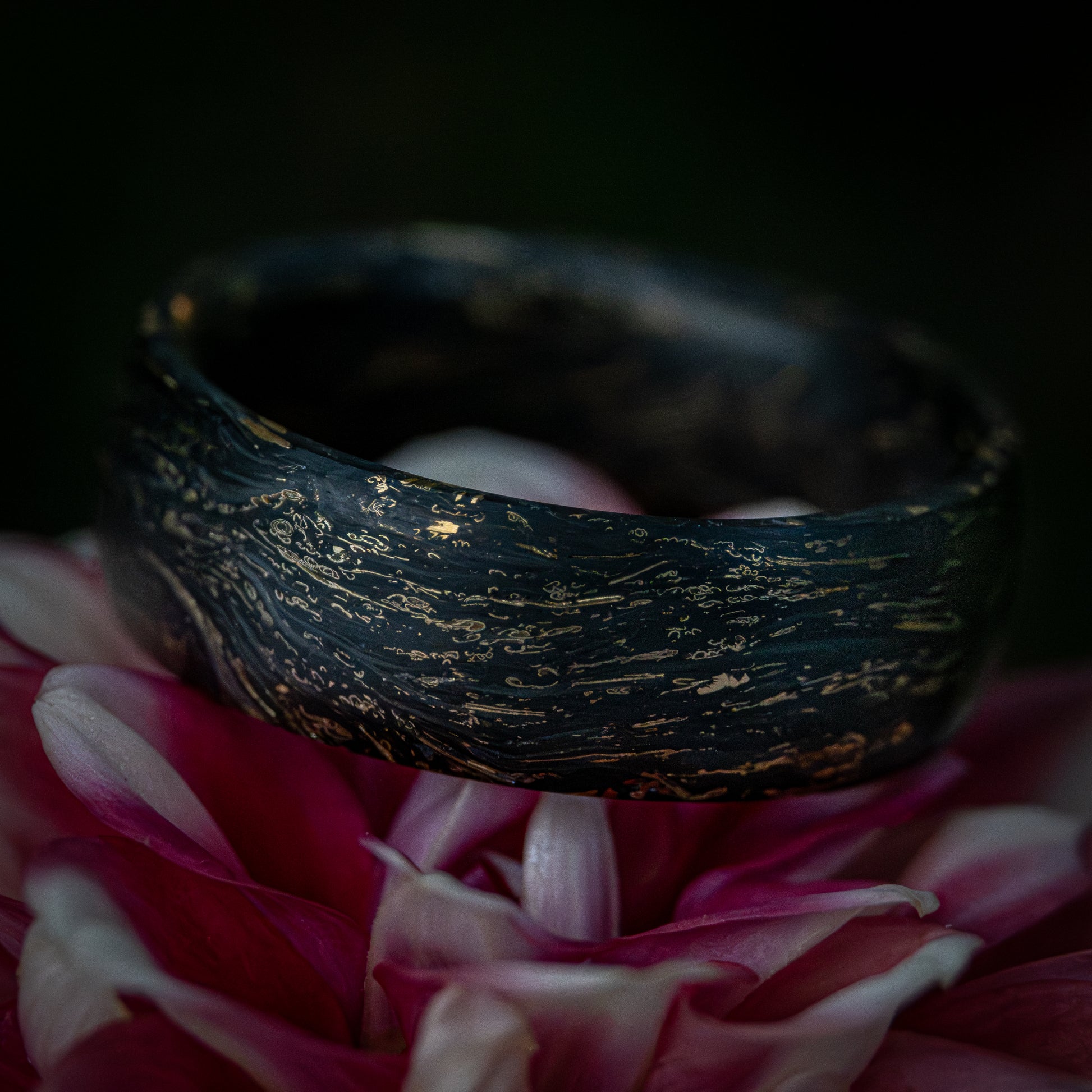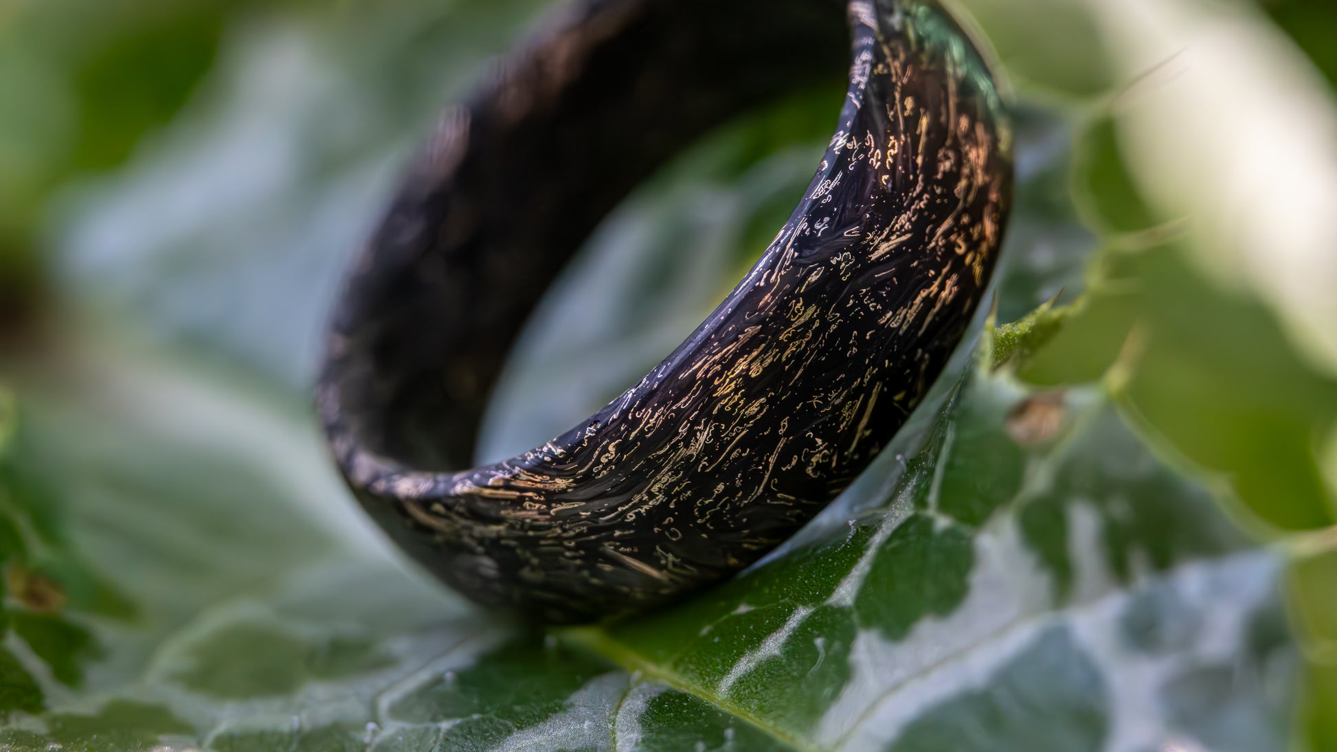 Tenhle prsten to prostě chápe. Je výrazný, ale ne přehnaný. Jedinečný, aniž by se snažil zaujmout za každou cenu. Vyrobený z vysoce odolného kovaného uhlíku, má hlubokou, mramorovanou černou texturu, která se mění podle světla. Jemné pruhy mosazi jím procházejí jako zlatý kouř – bez vzoru, jen čistá příroda v akci.