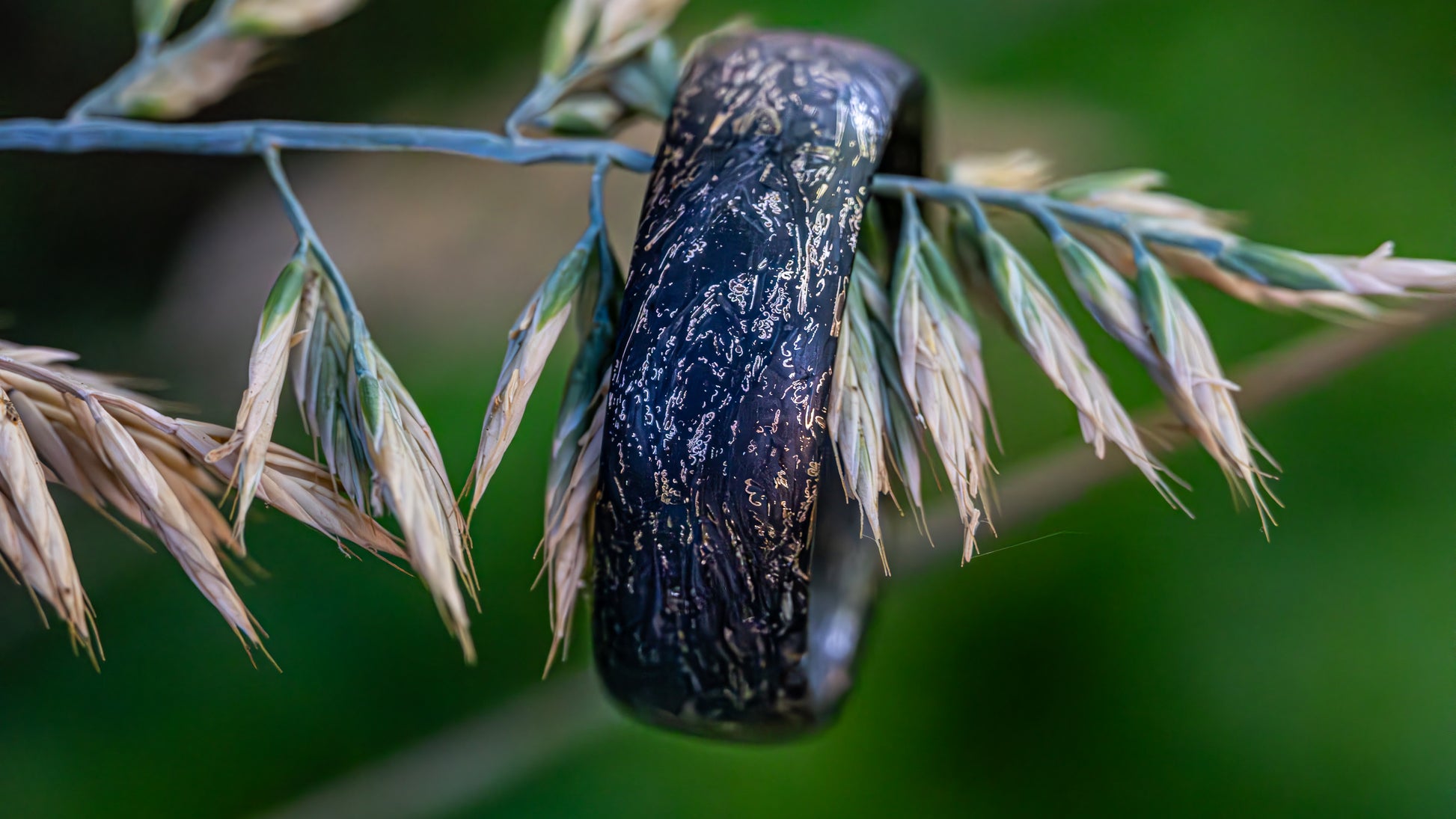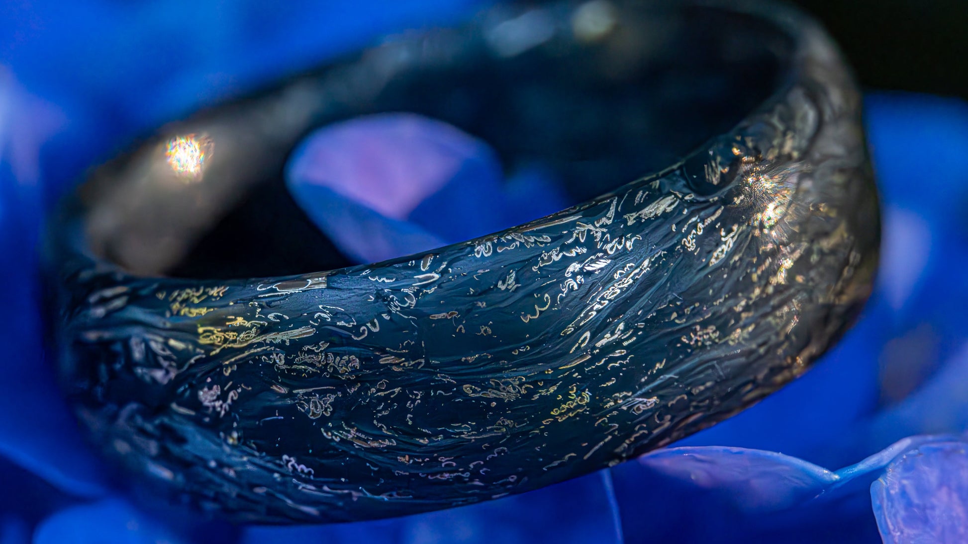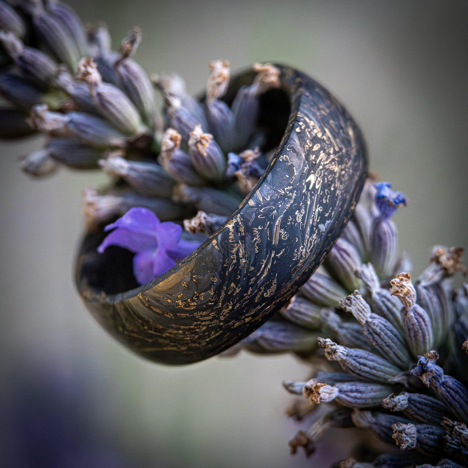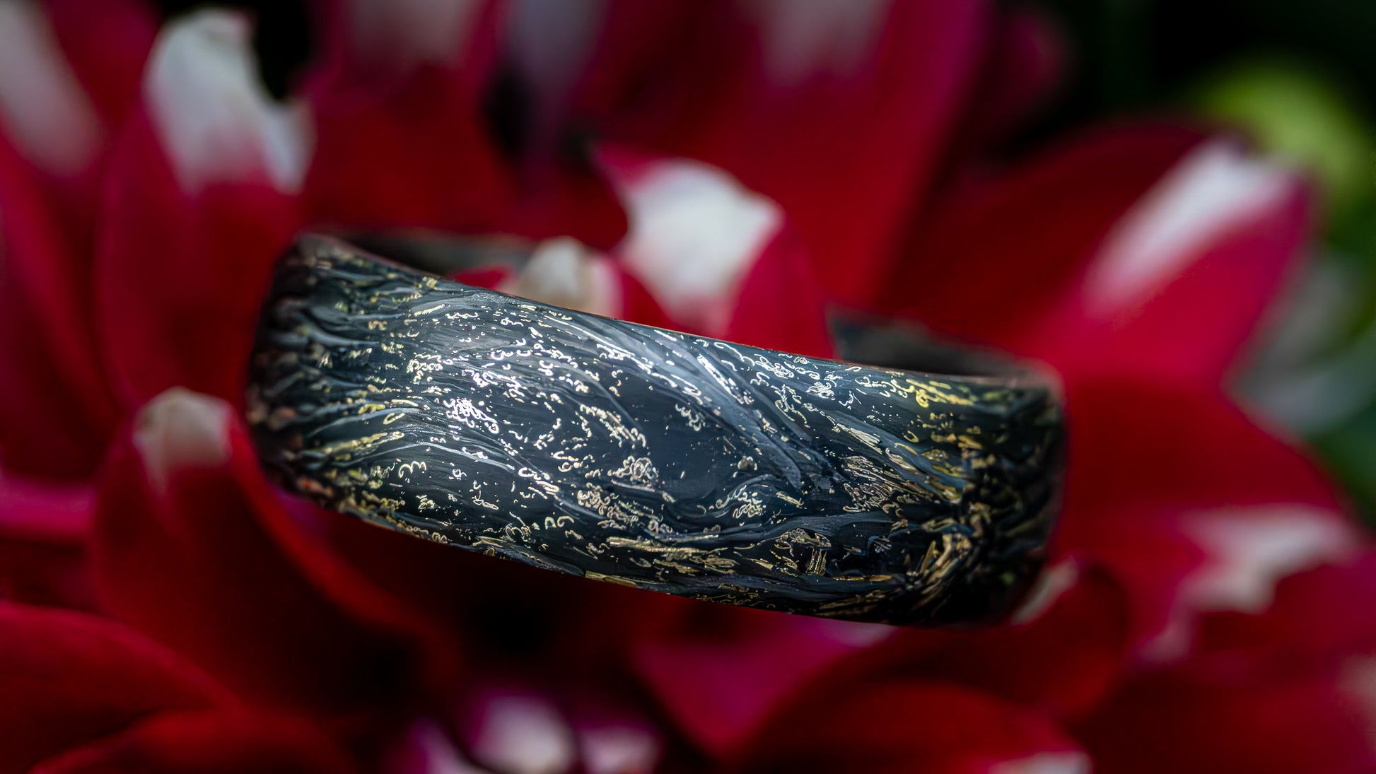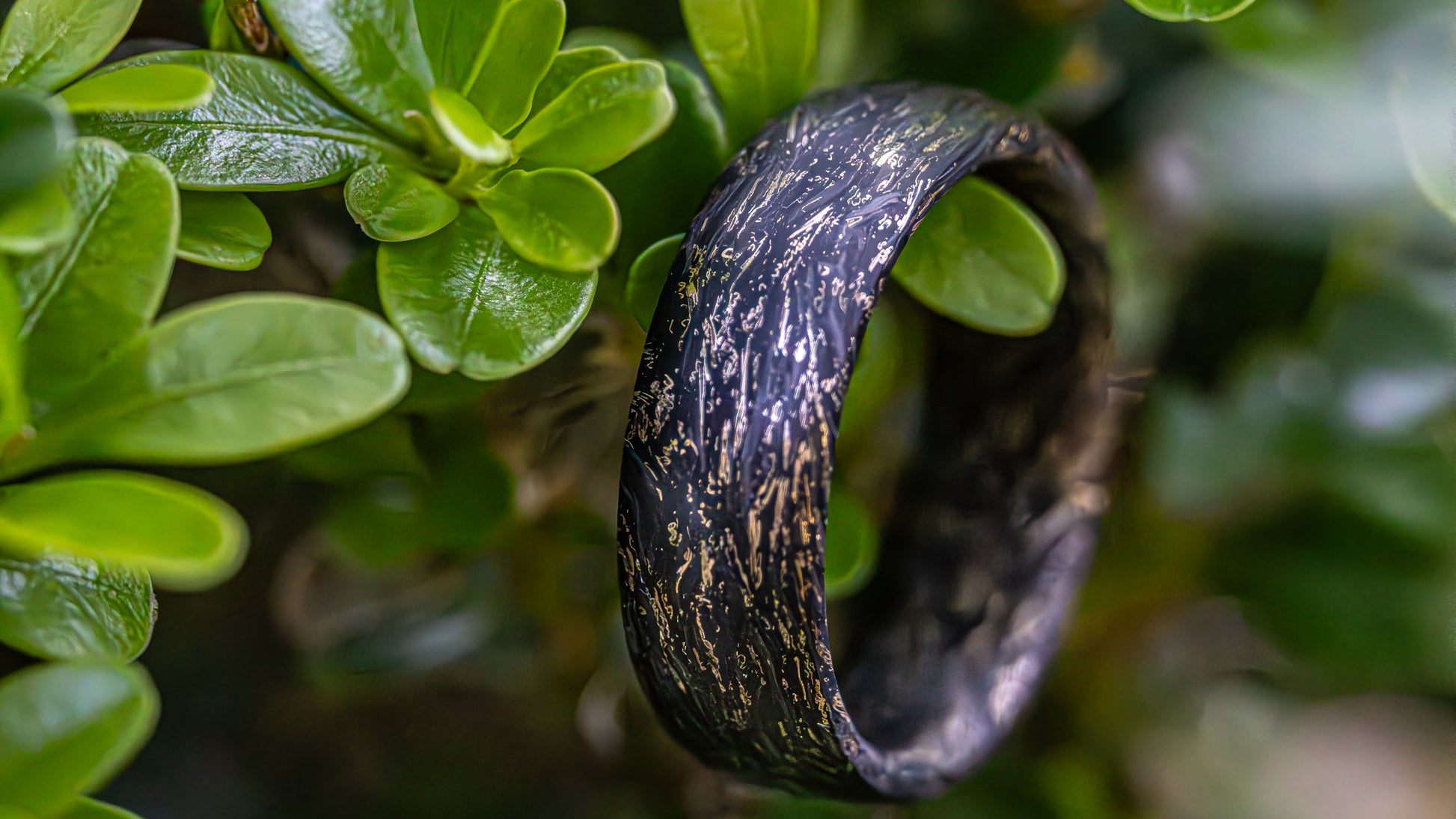 Tenhle prsten to prostě chápe. Je výrazný, ale ne přehnaný. Jedinečný, aniž by se snažil zaujmout za každou cenu. Vyrobený z vysoce odolného kovaného uhlíku, má hlubokou, mramorovanou černou texturu, která se mění podle světla. Jemné pruhy mosazi jím procházejí jako zlatý kouř – bez vzoru, jen čistá příroda v akci.